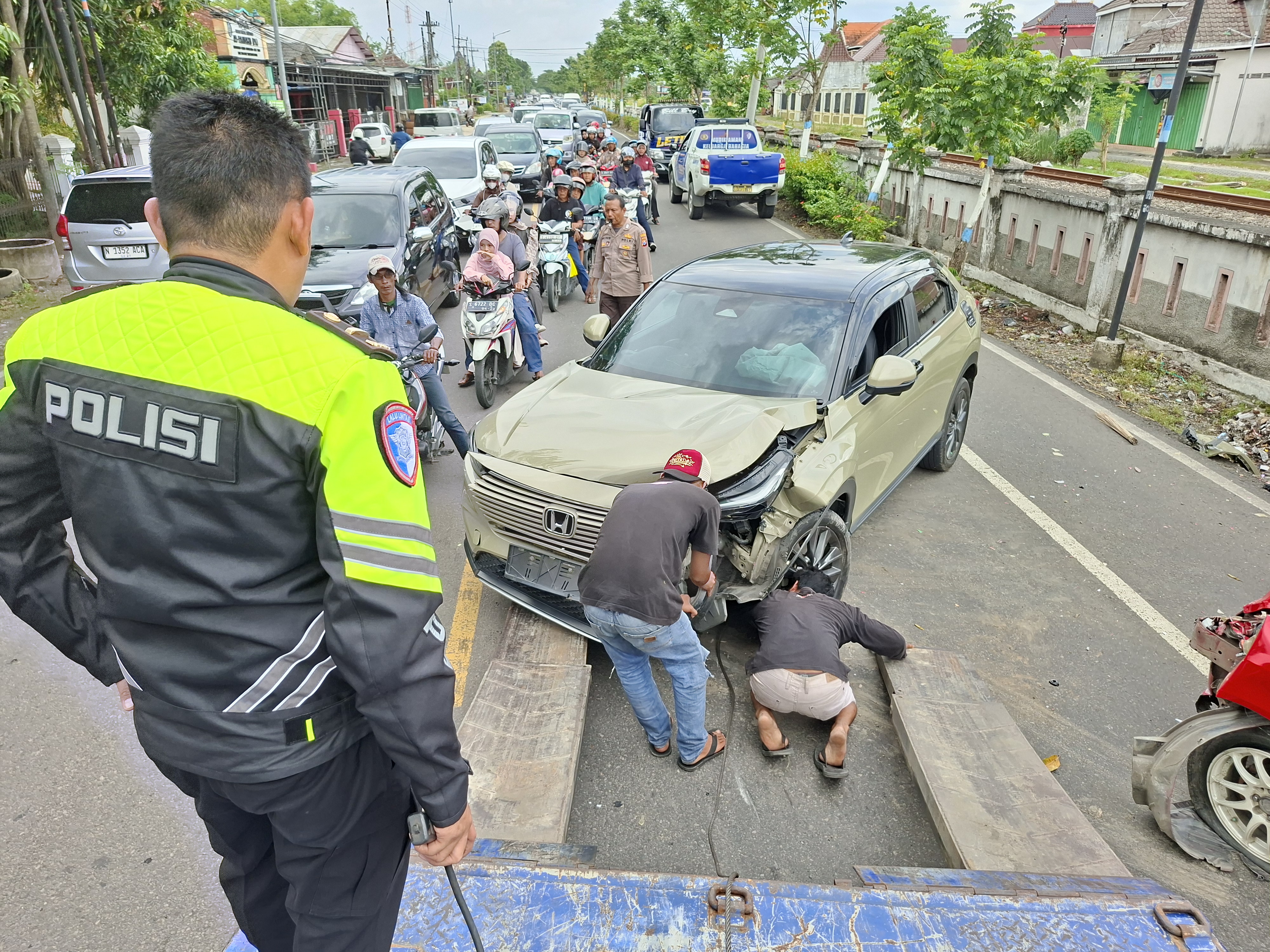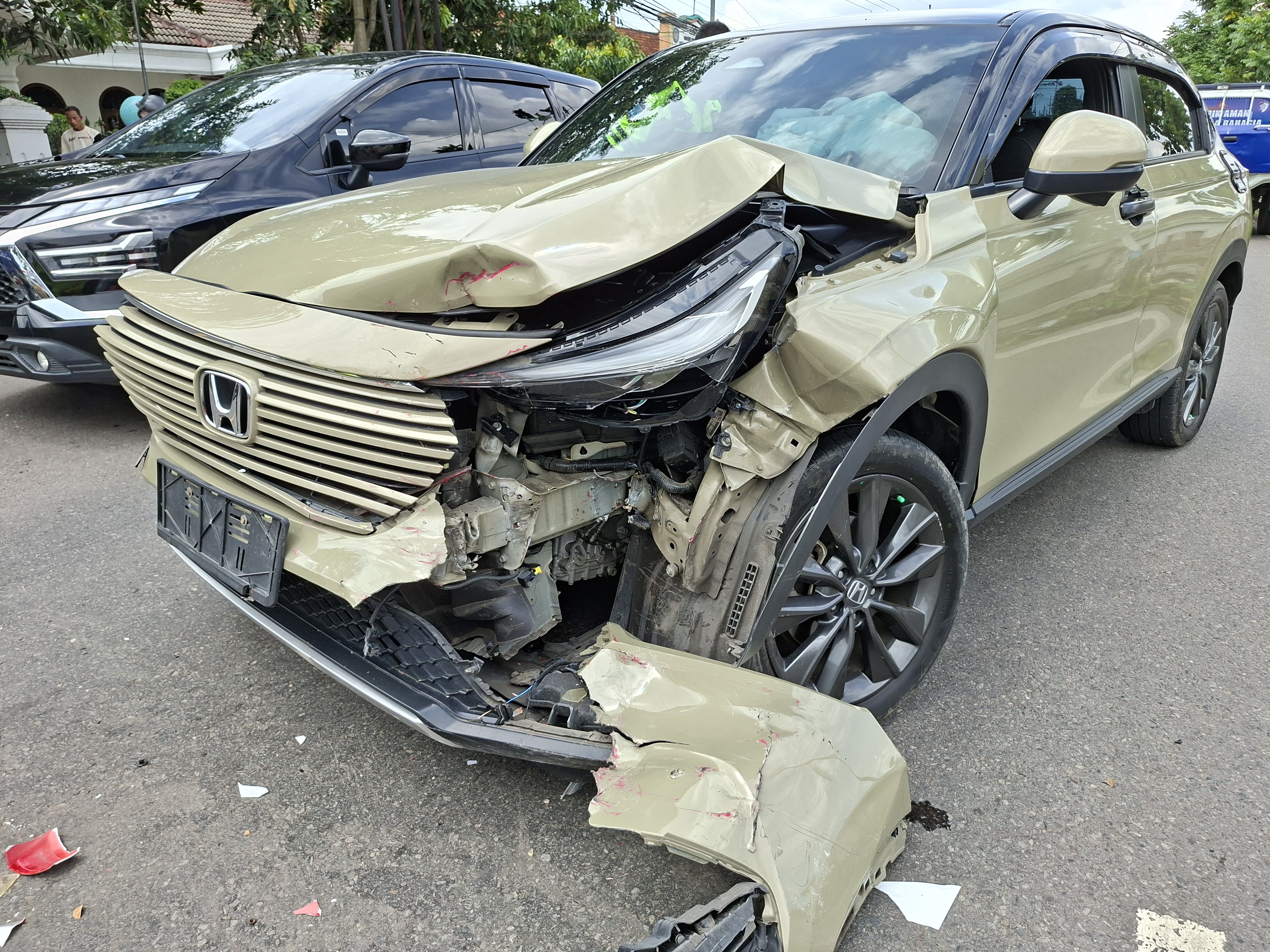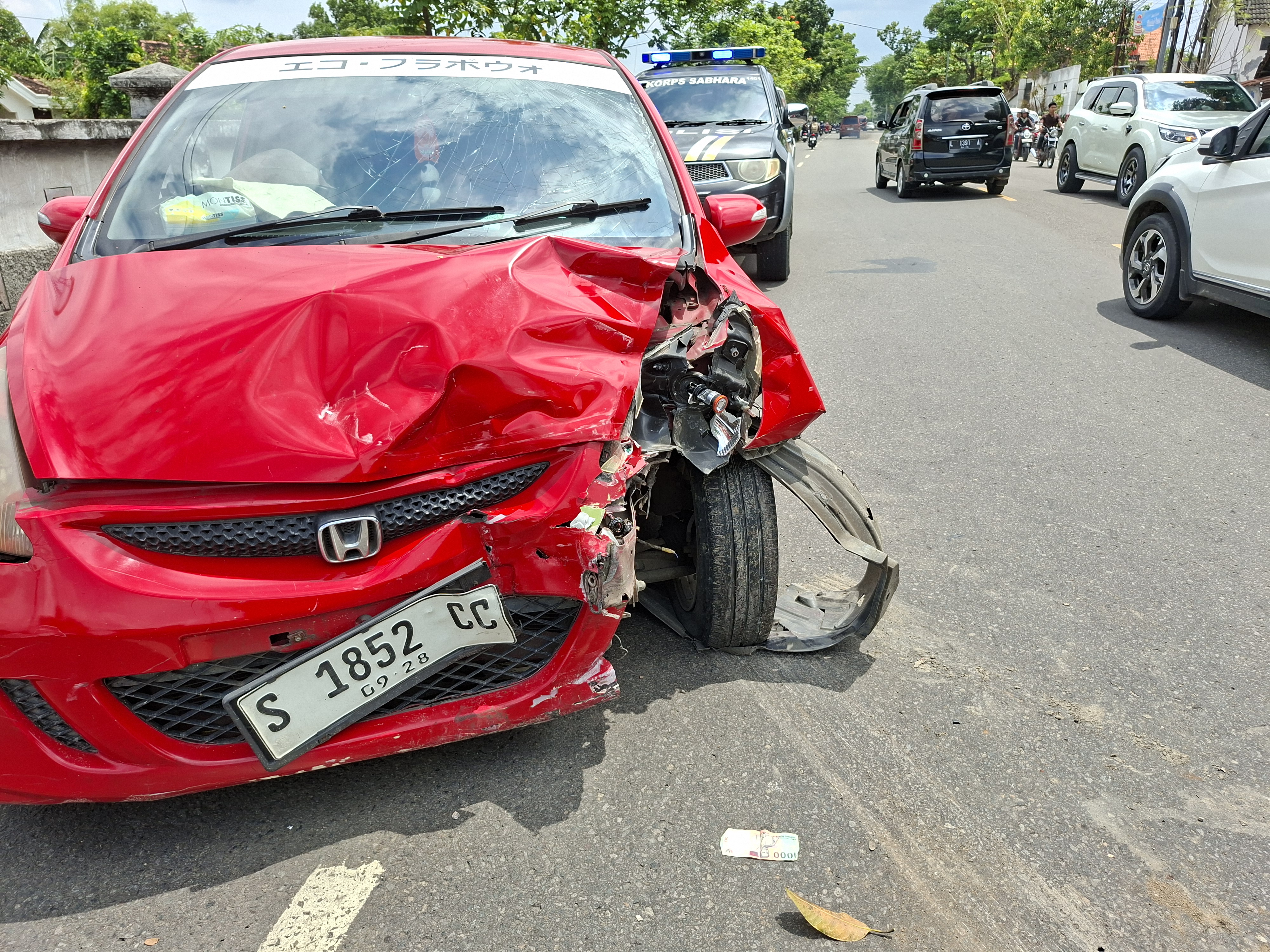 BOJONEGORO - Dua unit mobil, Honda Jazz bernopol S 1852 CC dan Honda HRV bernopol L 999 IM, mengalami kerusakan parah setelah terlibat kecelakaan di Desa Margomulyo, Balen, Bojonegoro, Sabtu siang (21/3). Pihak kepolisian menyebutkan kecelakaan dipicu oleh kendaraan dari arah barat yang melambung terlalu ke kanan. Tidak ada korban jiwa dalam peristiwa ini, namun lima orang dievakuasi untuk mendapatkan perawatan medis.
