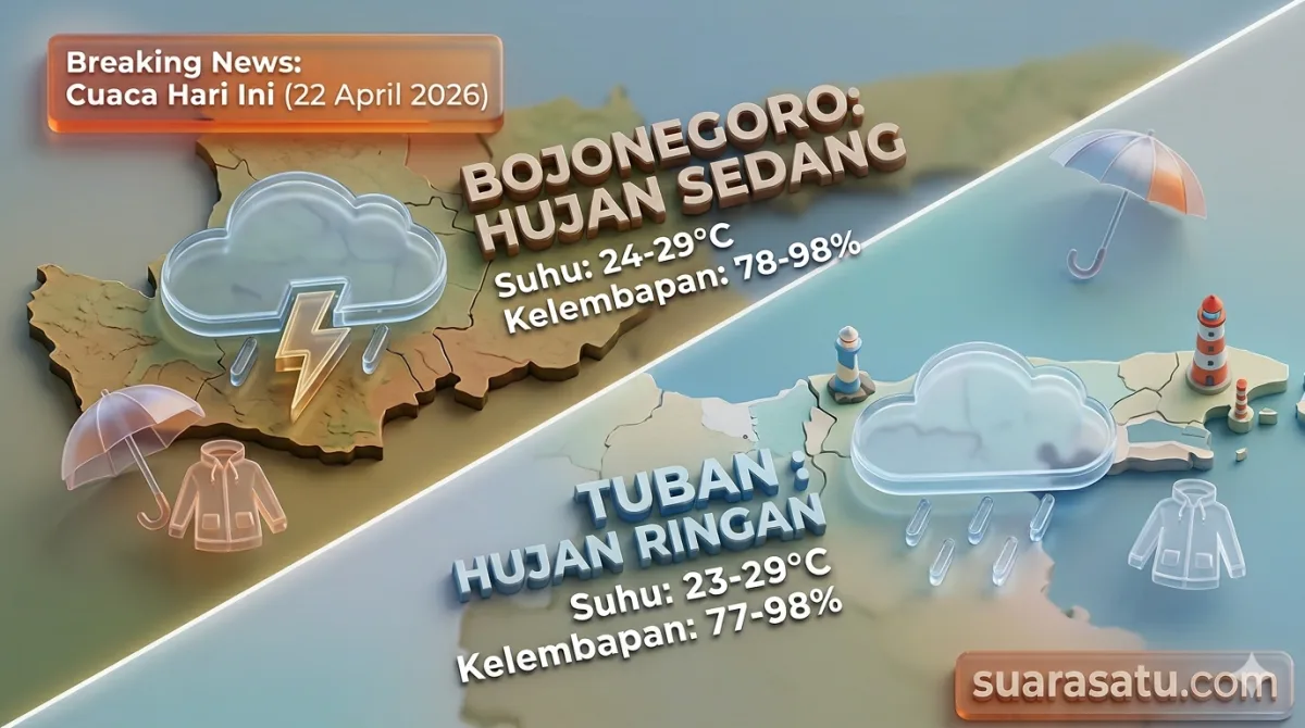 SUARASATU.COM- Bagi warga di wilayah Bojonegoro dan Tuban yang hendak beraktivitas di luar ruangan hari ini, Rabu (22/4/2026), sebaiknya mulai menyiapkan payung atau jas hujan. BMKG memprediksi kedua wilayah di Jawa Timur ini akan diguyur hujan dengan intensitas yang berbeda.